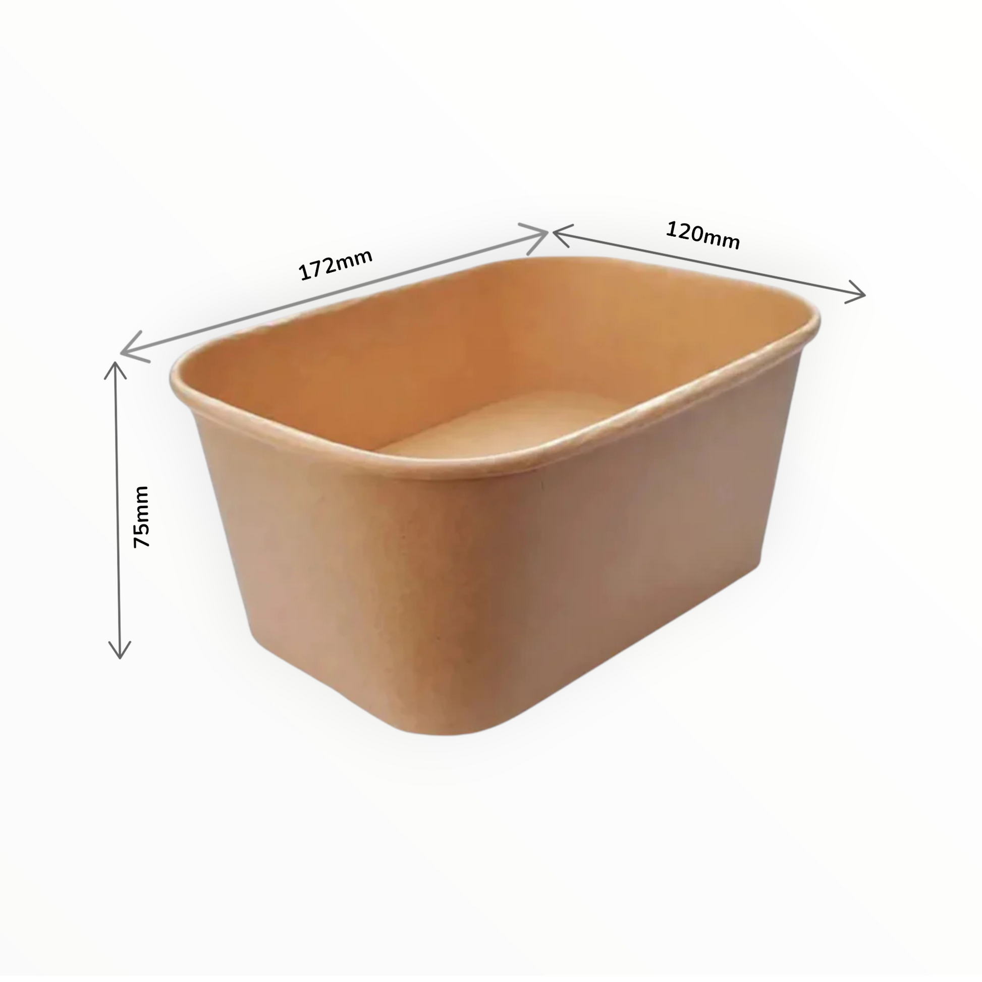 The 1000ml Rectangular Kraft is made of sustainable cardboard, double-lined inside and out with PE to make it leak—and grease-proof.