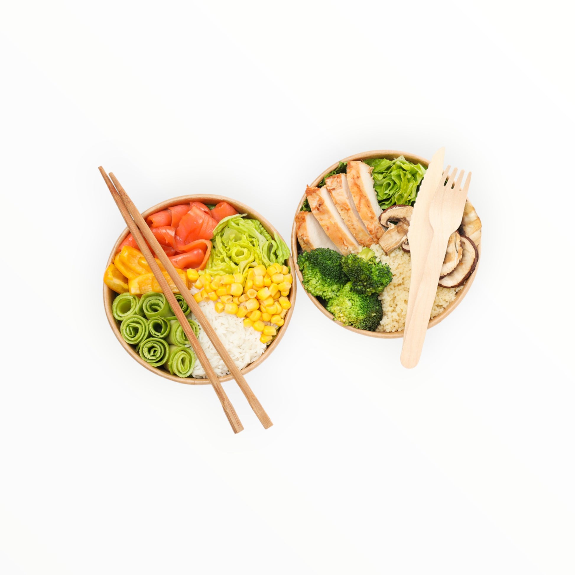 The 1300ml Kraft Bowl is made of sustainable cardboard, double-lined inside and out with PE to make it leak—and grease-proof.