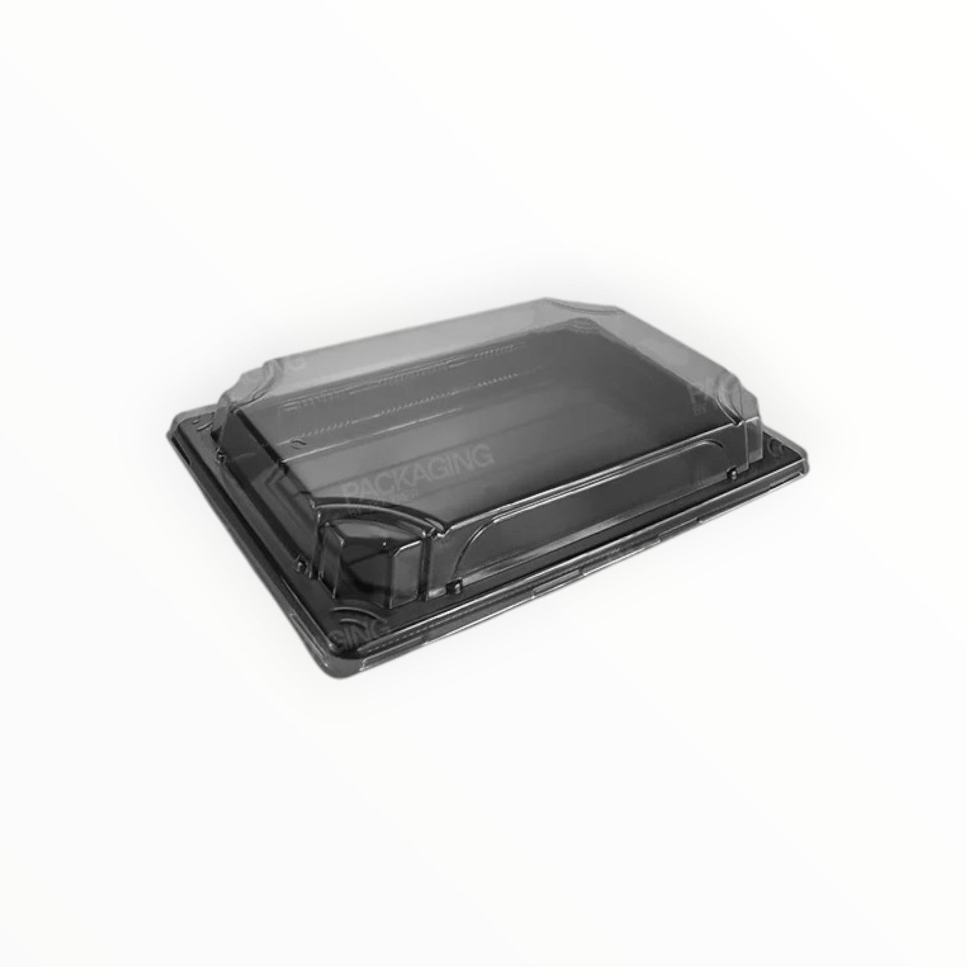 The Black Sushi Container Base & Lid is made of PS plastic and has a clear snap-on lid.